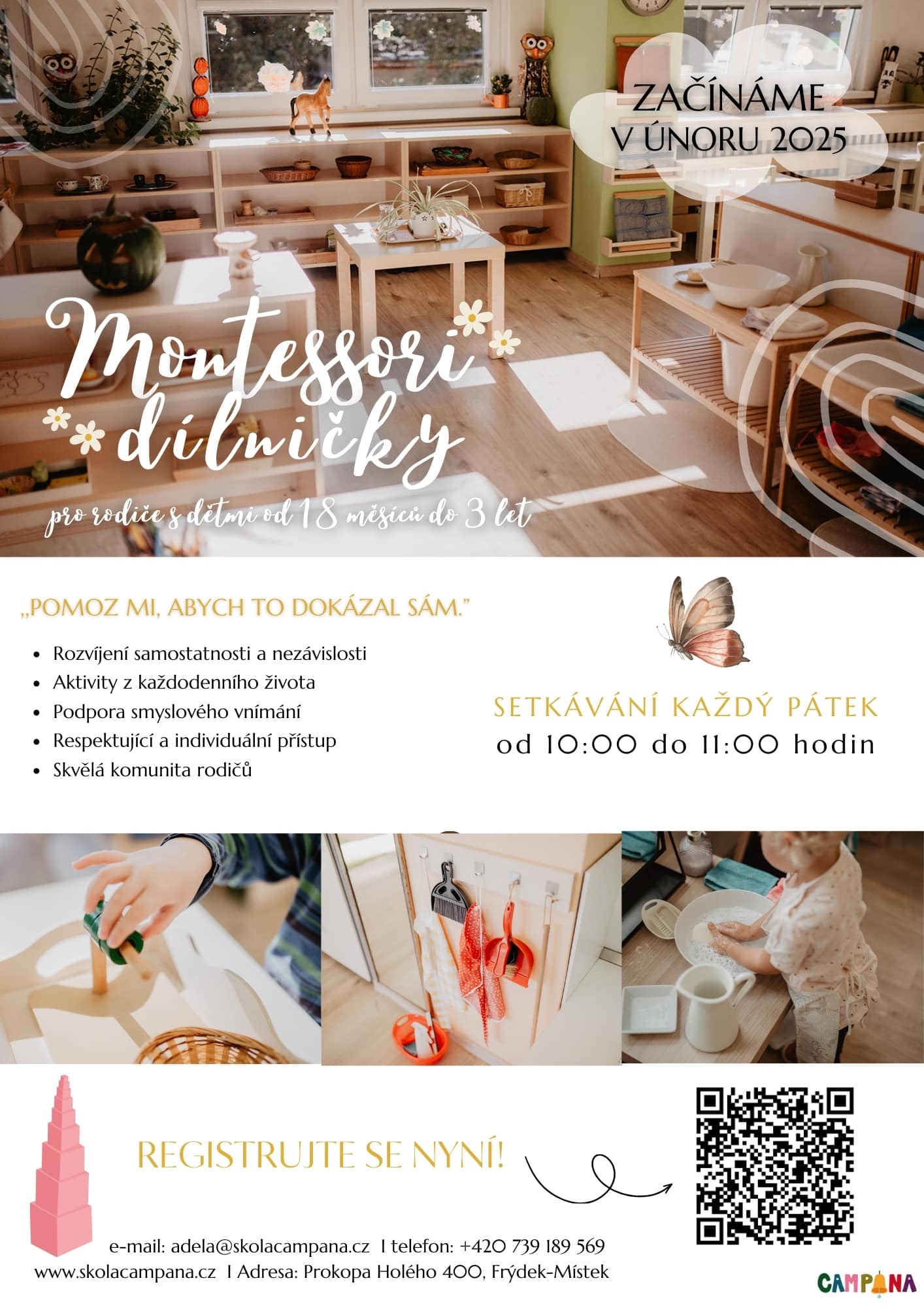 Setkávání probíhá každý pátek od 10:00 do 11:00 hodin v prostorech Montessori centra Campana ve Frýdku-Místku.